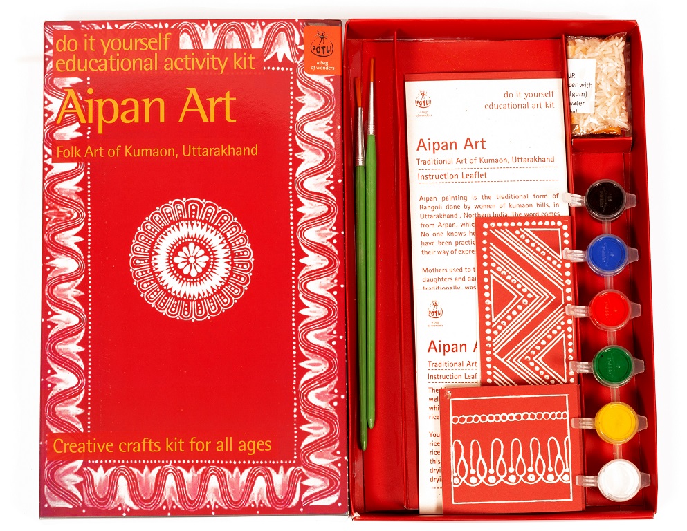 An Educational Art Kit of Aipan Painting, a Traditional Art of Uttarakhand. Ideal for ages : 5 years+ Adult participation recommended to read story from the facts sheet. Includes 10 colouring cards , 2 book marks , 2 gift tags , 6 child safe non toxic paints, 2 brushes, 2 packs of raw materials for making natural colour and a fact sheet about the art form. Dimension 15x26x3 This Kit encourages non-digital and tactile play. We stimulate creative thinking and imaginative play while sharing the rich cultural heritage of India