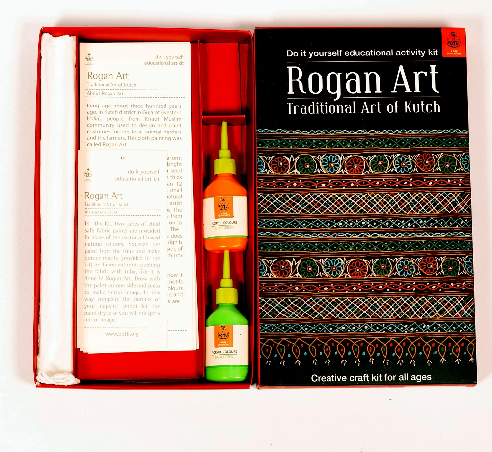 Ideal to make children aware of Indian Culture through fun colouring cards. An Educational Art Kit of Rogan Art of Kutch – Traditional Art of Gujarat. Includes 2 colouring cards , 2 book marks , 2 gift tag , 2 gift boxes , 6 child safe non toxic paints , 2 brushes , 2 packs of raw materials for making natural colour and a fact sheet about the art form.