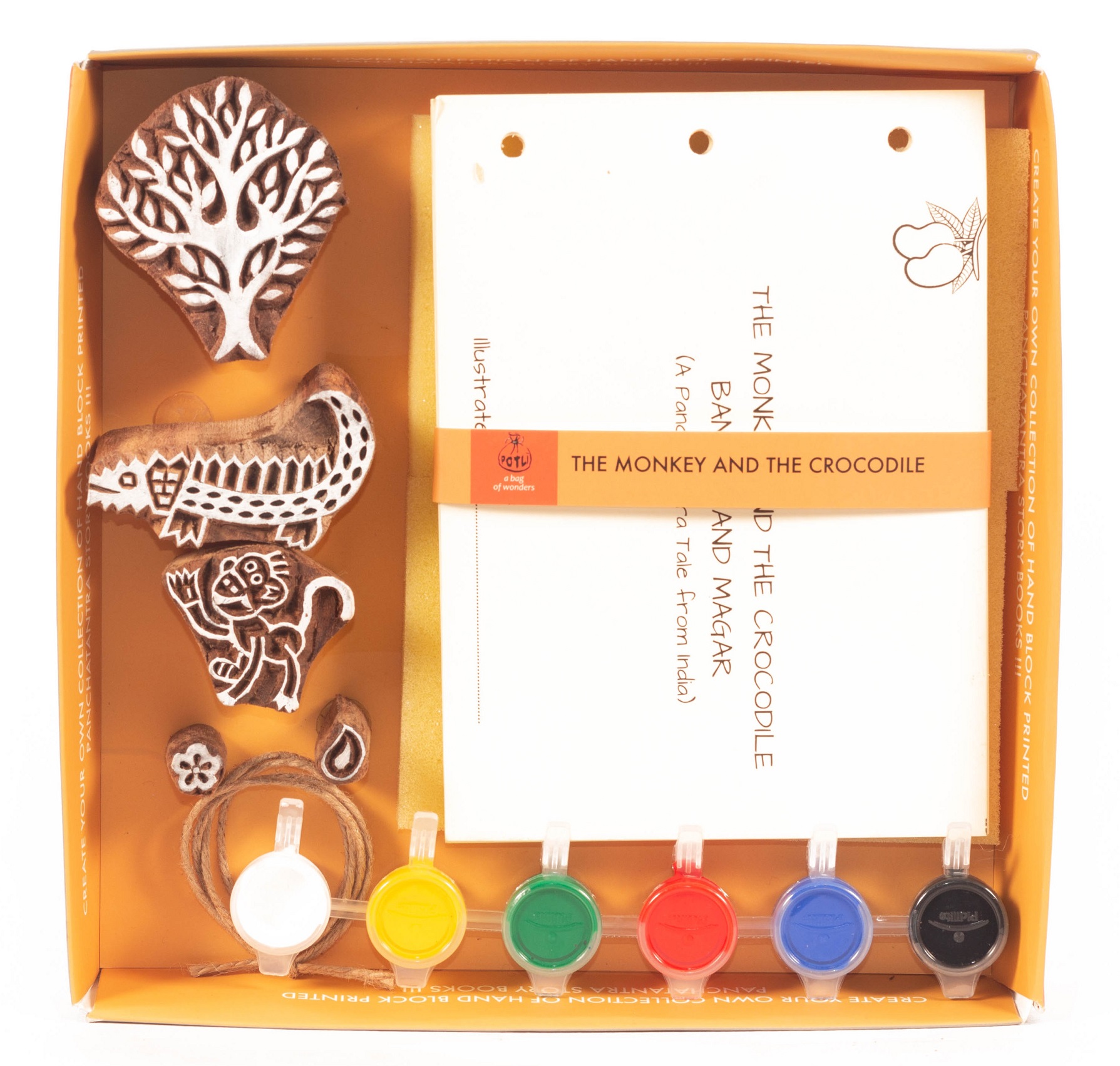 This kit includes 5 hand carved wooden stamps , poster colours, painting brush, printing pads, story cards for printing , jute string for binding the book and instructions sheet. High Quality Material : 100% sheesham wood , non toxic water based paints, child safe . Our Series of Panchtantra Block Printing Kits is the most popular amongst our young customers . Multi-use Ideal to make children aware of Indian traditional crafts through fun games and activities.Use the blocks later for creating your own stationary, recycled wrapping paper, crafts, picture-making, greeting cards, party invitations, scrap booking and more! Dimension 19x19x3.5
